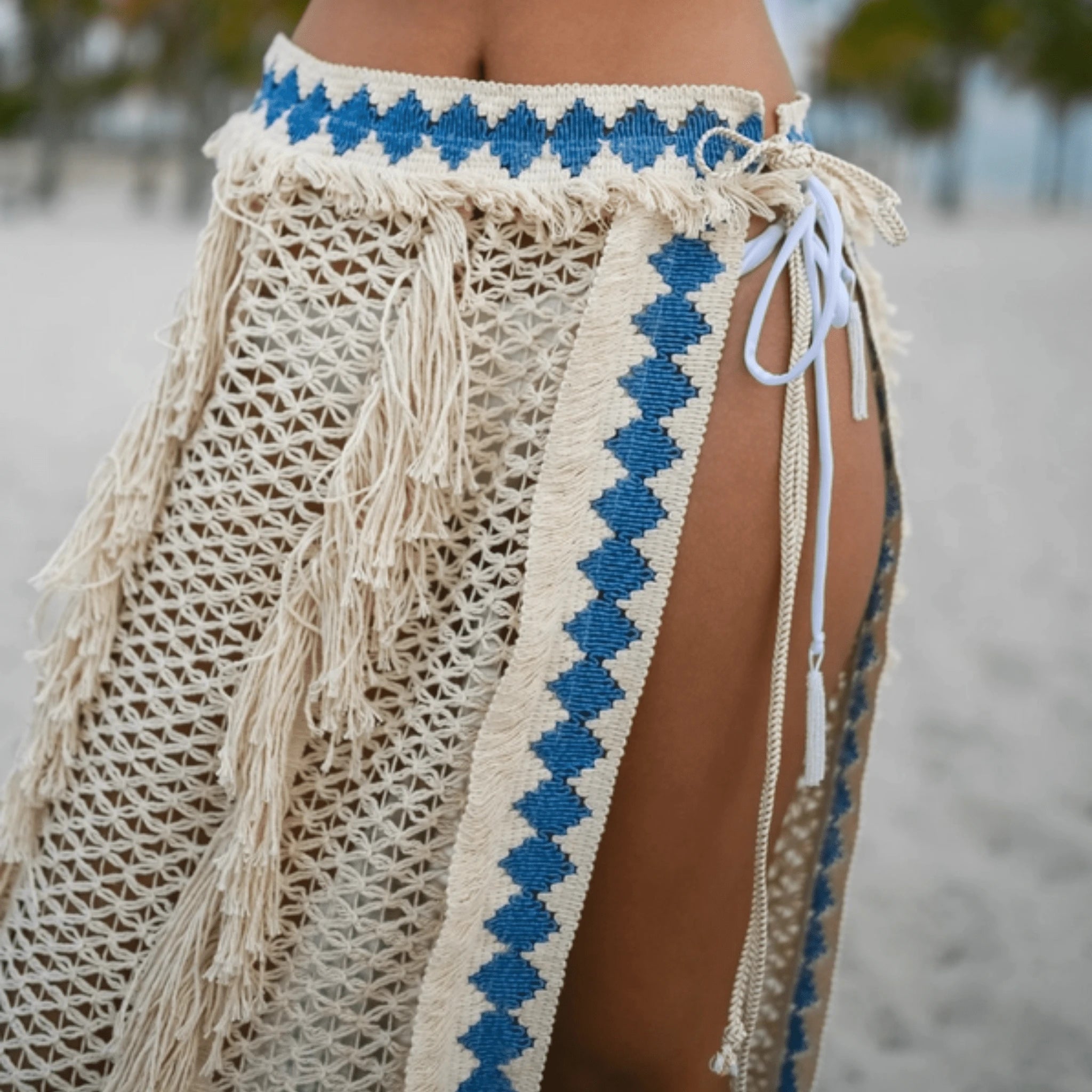 Woven from soft, breathable cotton, this resort knit pareo flows with every step. Natural fringes, a blue embroidered border, and delicate knit details add boho charm. Light as air and curve-hugging at the waist, it’s perfect for beach days or breezy festival nights.